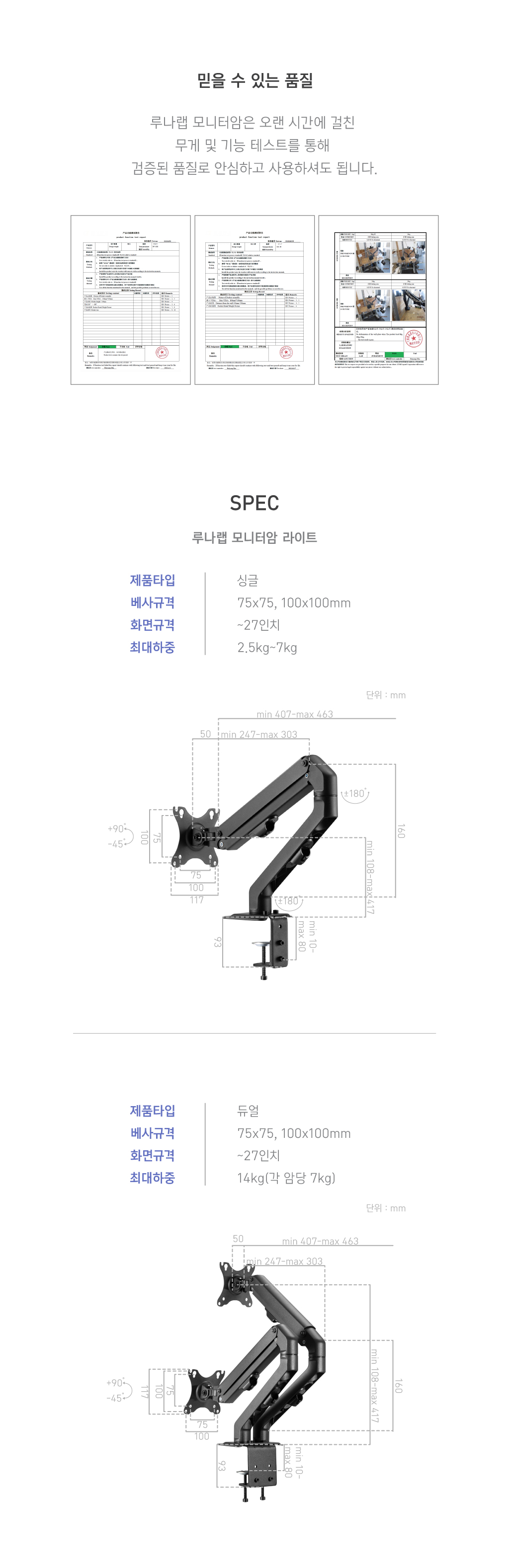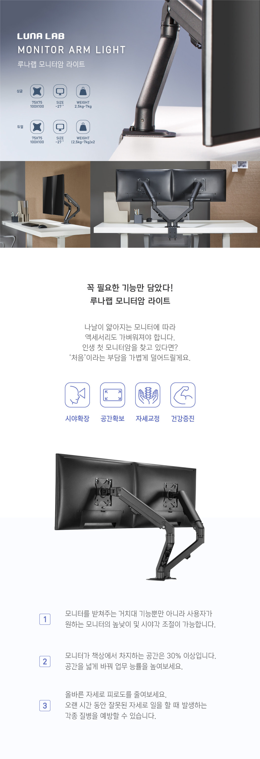 루나랩 모니터암 거치대 싱글 블랙 라이트