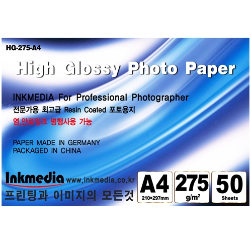 [잉크미디어]고광택 포토용지 인화지 RC독일산 275g A4 5권 (250매)