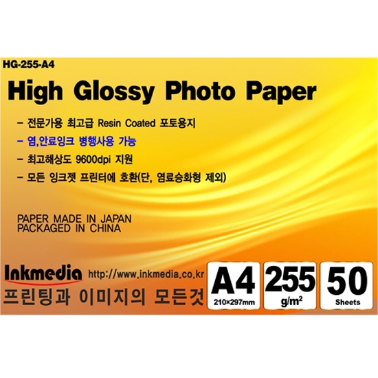 [잉크미디어]고광택 포토용지 인화지 RC일본산 255g A4 5권 (250매)